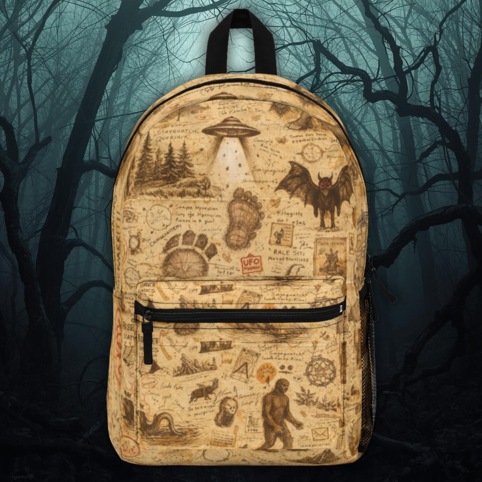 A functional everyday backpack wrapped in weird Americana energy. Designed for commuters, students, travelers, and cryptid believers alike.