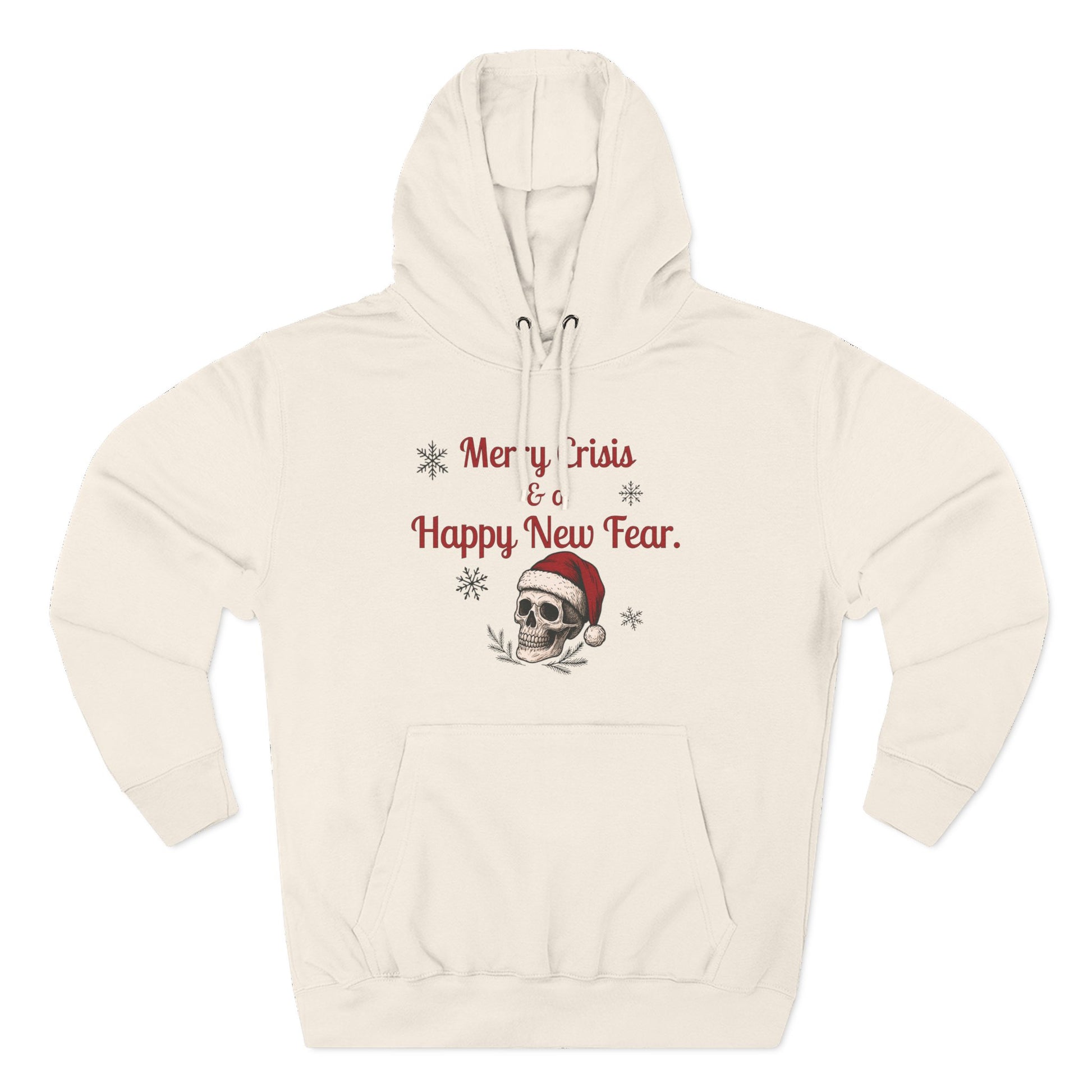 Merry Crisis & a Happy New Fear. For the ones surviving the season, not sugar-coating it. A cheeky dark-holiday hoodie with boutique polish.