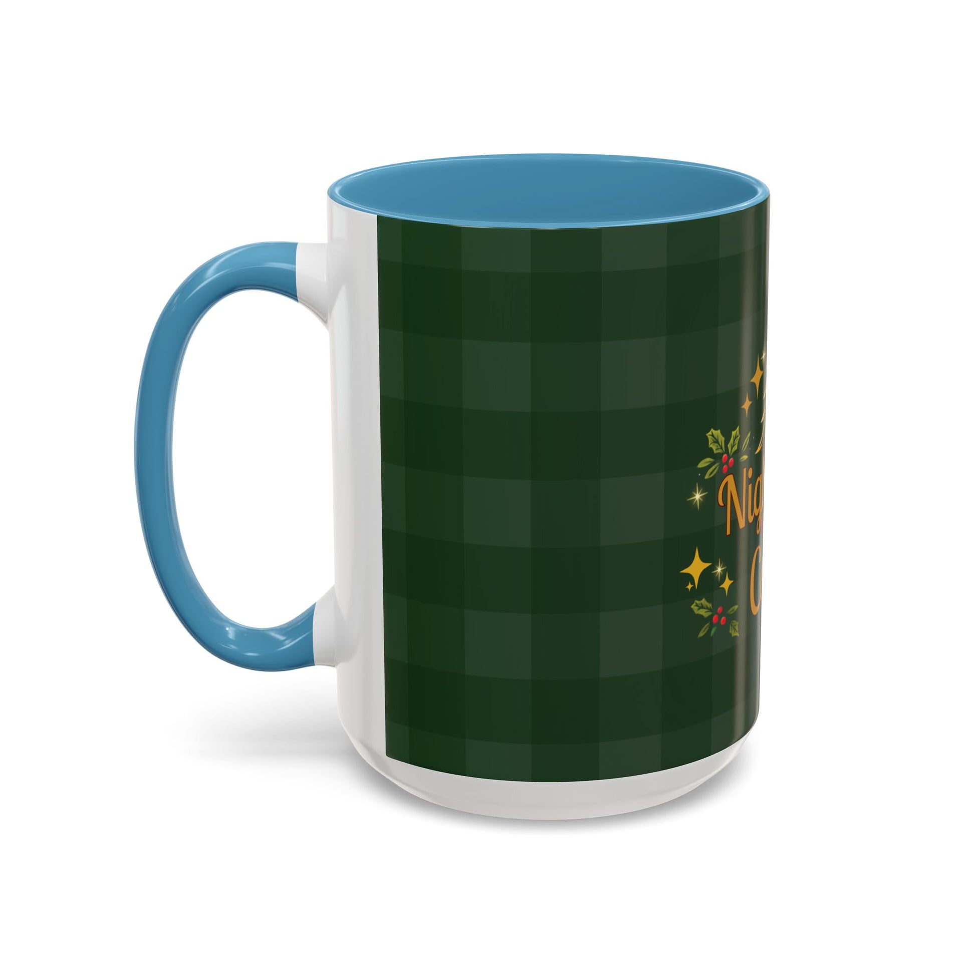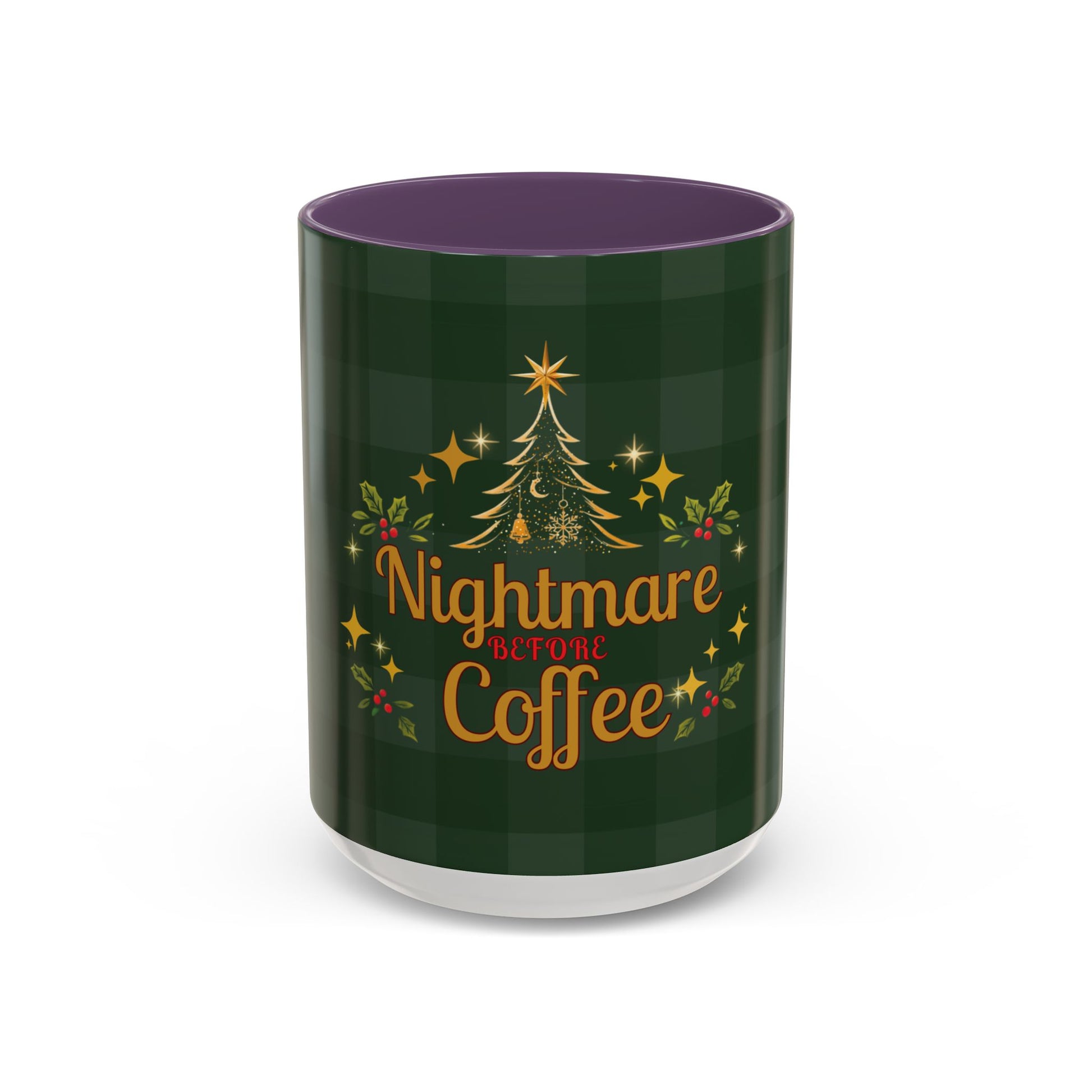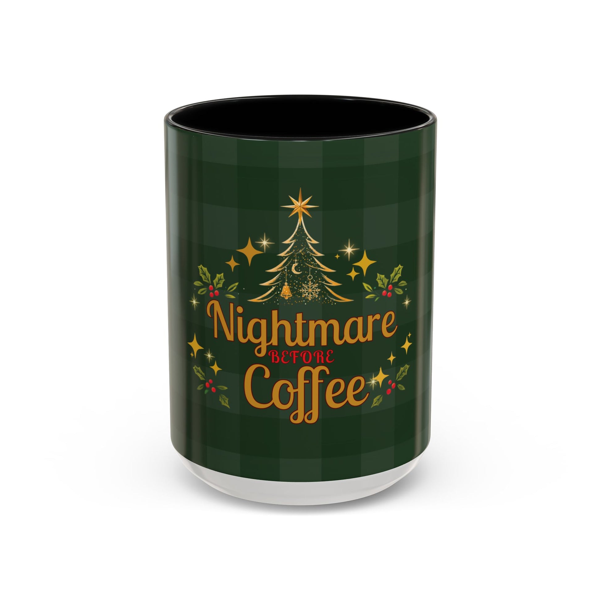 “Nightmare Before Coffee” — the most honest holiday mood. Dark green plaid, gold sparkle accents, and a Christmas tree that knows you’re running on caffeine and chaos. A festive mug for December mornings (or mornings in general).