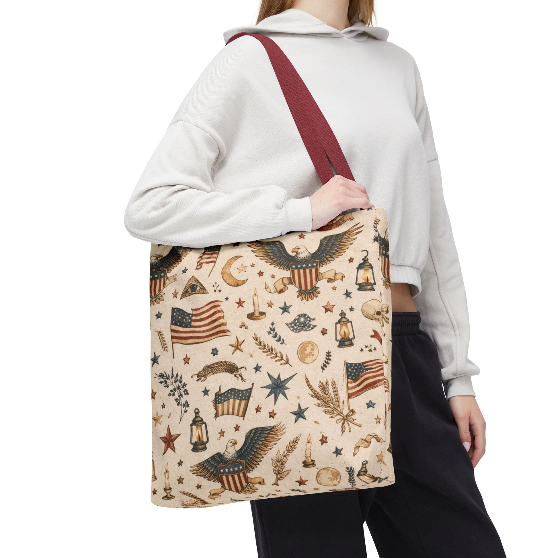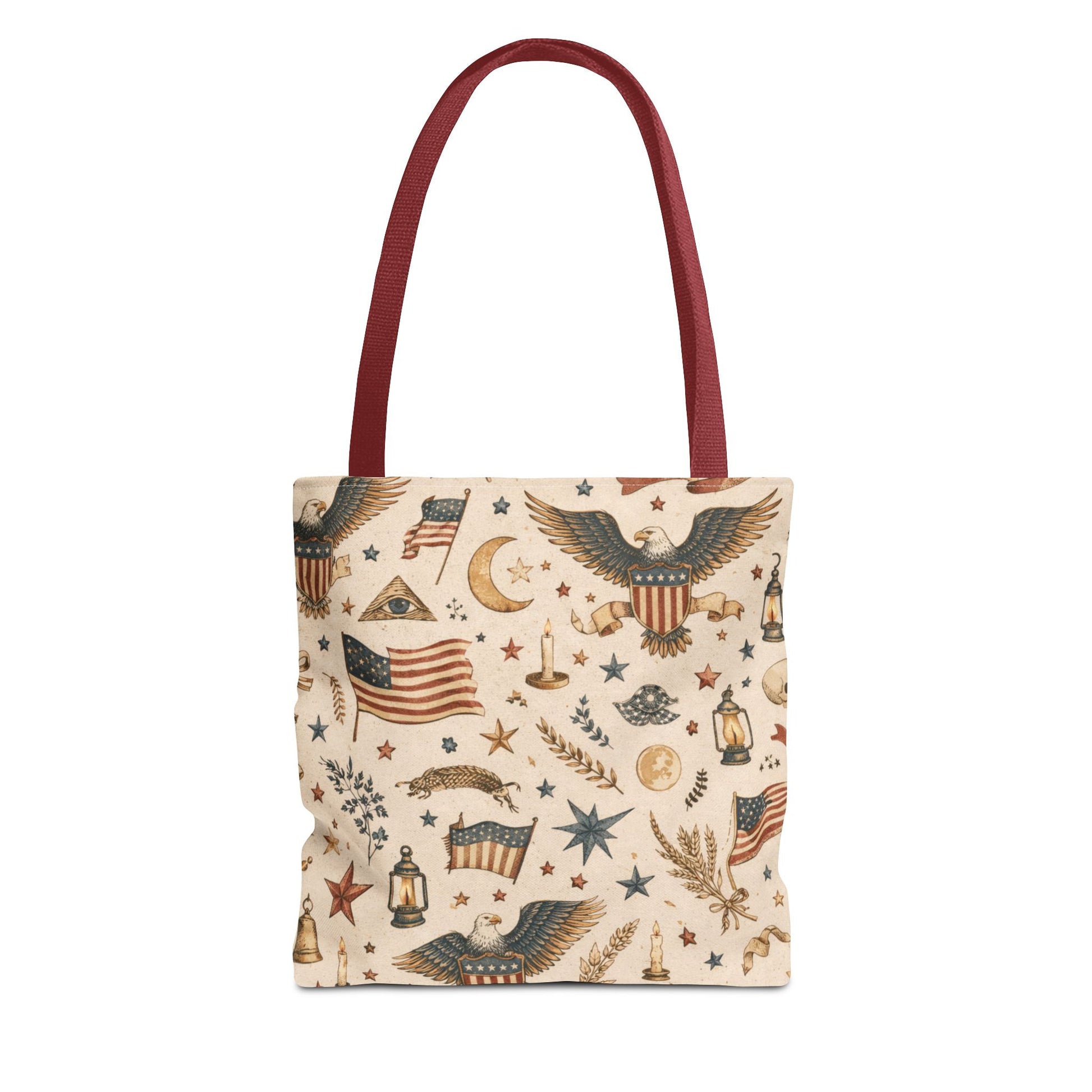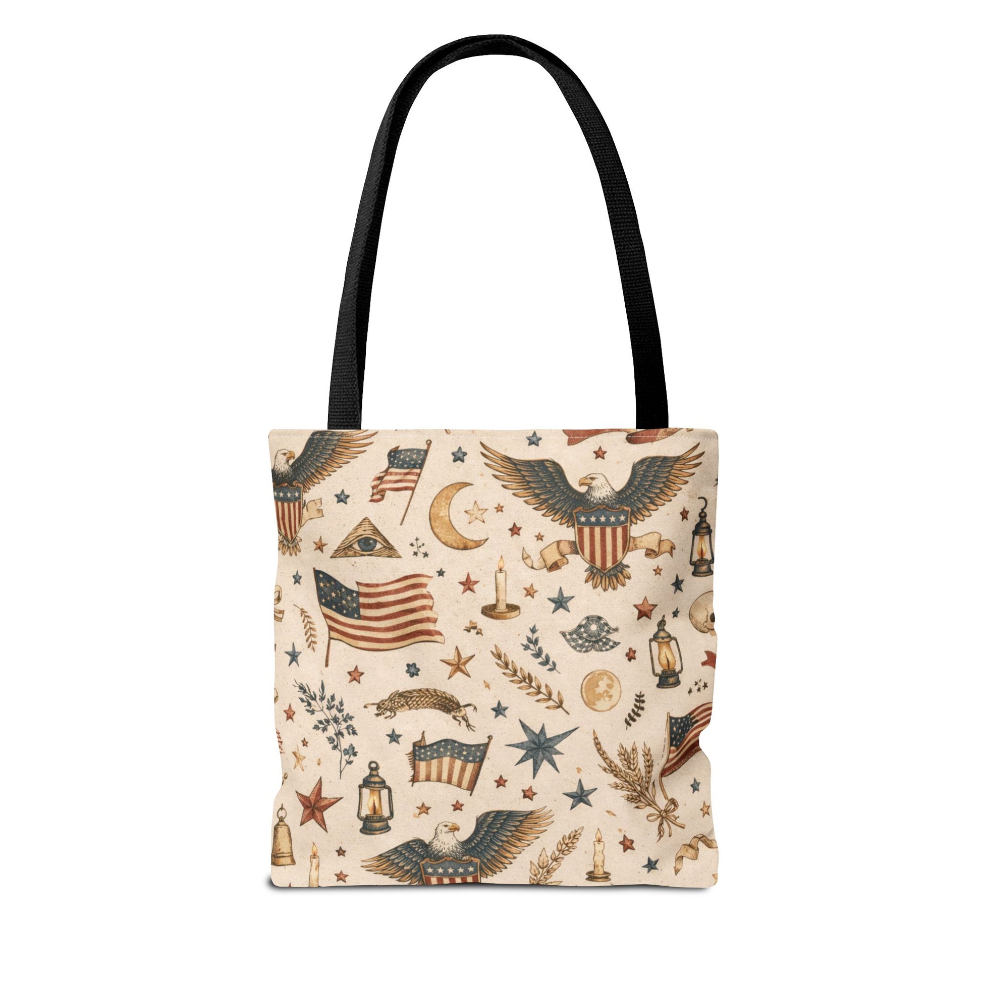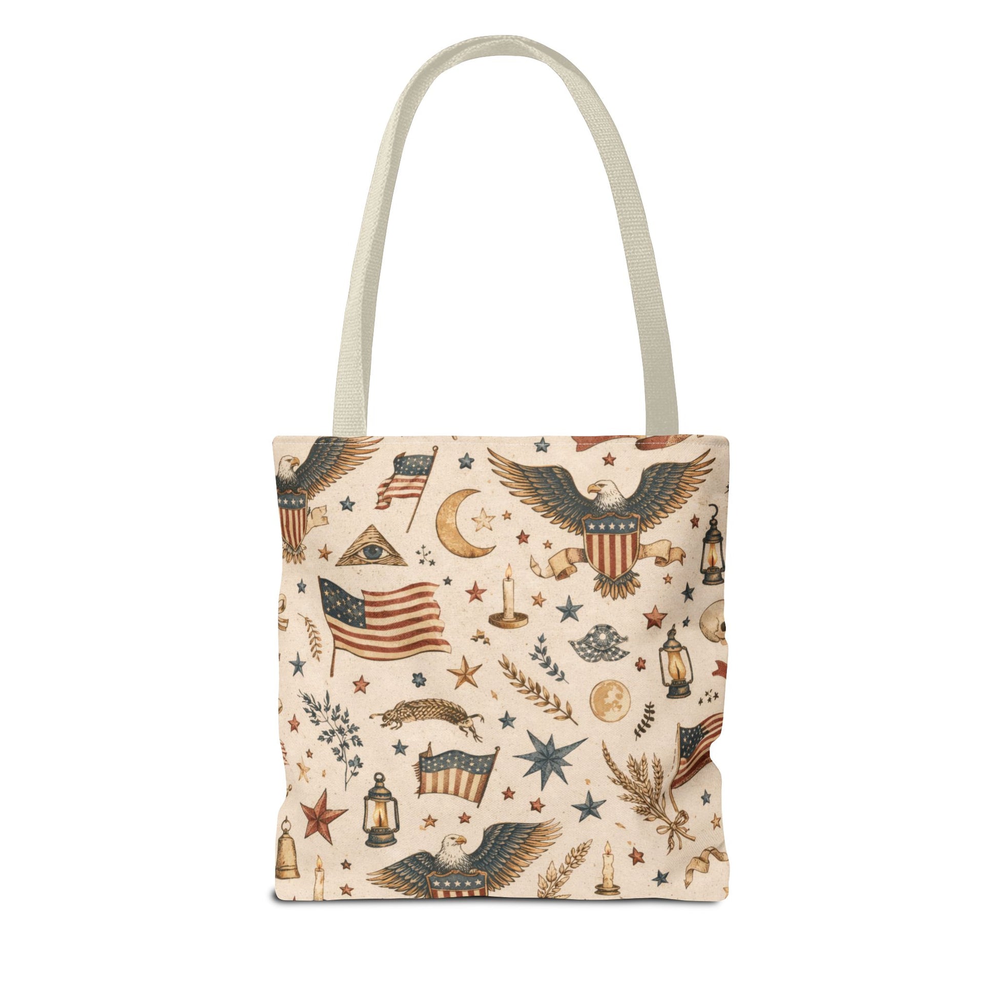 A warm, vintage Americana story—stitched into an everyday tote. Eagles, lanterns, stars, wheat, and old-world symbols come together in a parchment-toned all-over print that feels like a found relic… but built for real life. Durable, functional, and designed to stand out without screaming.
