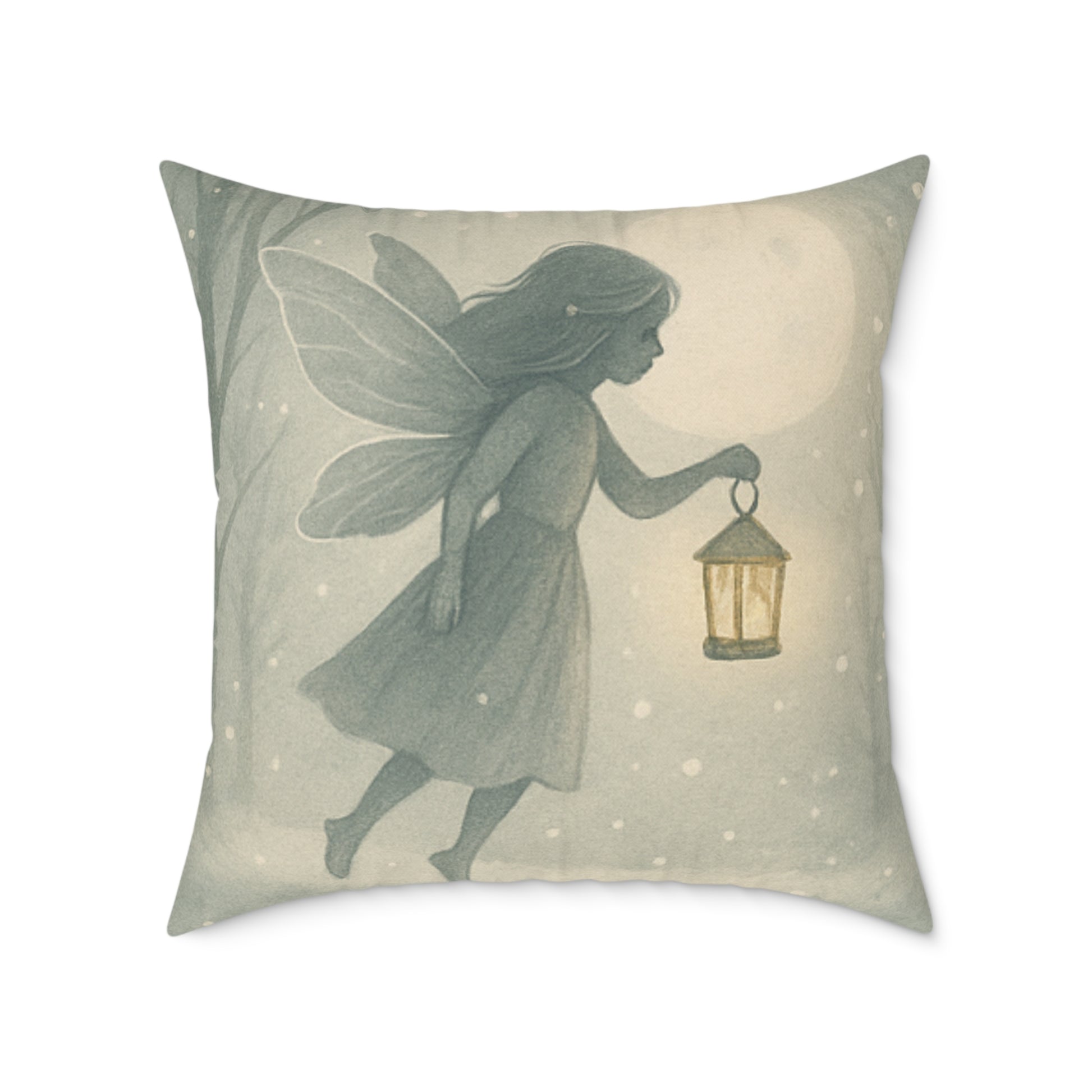 Cozy Winter Fairy Throw Pillow – Tea on a Toadstool & Lantern Fairy Canvas Cushion