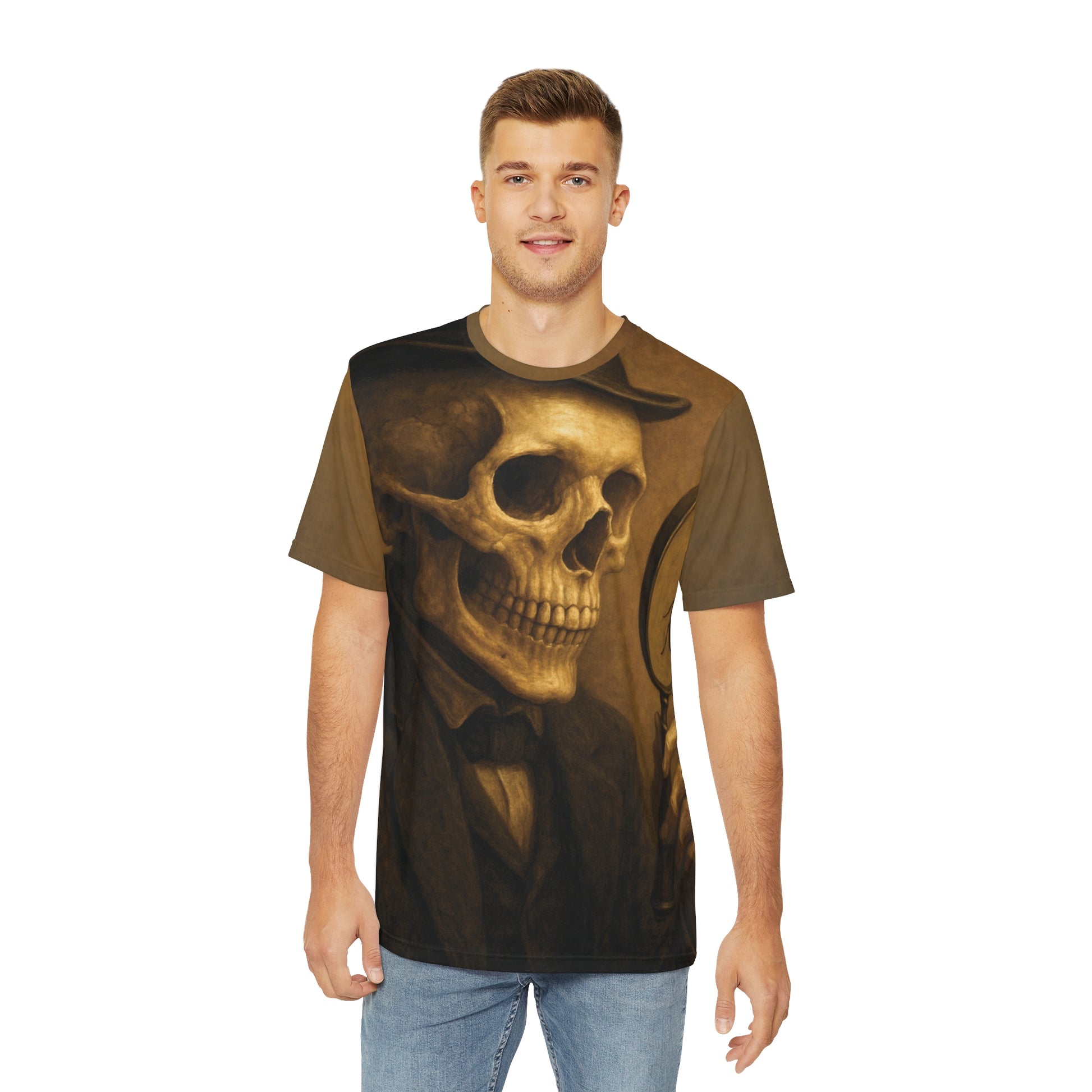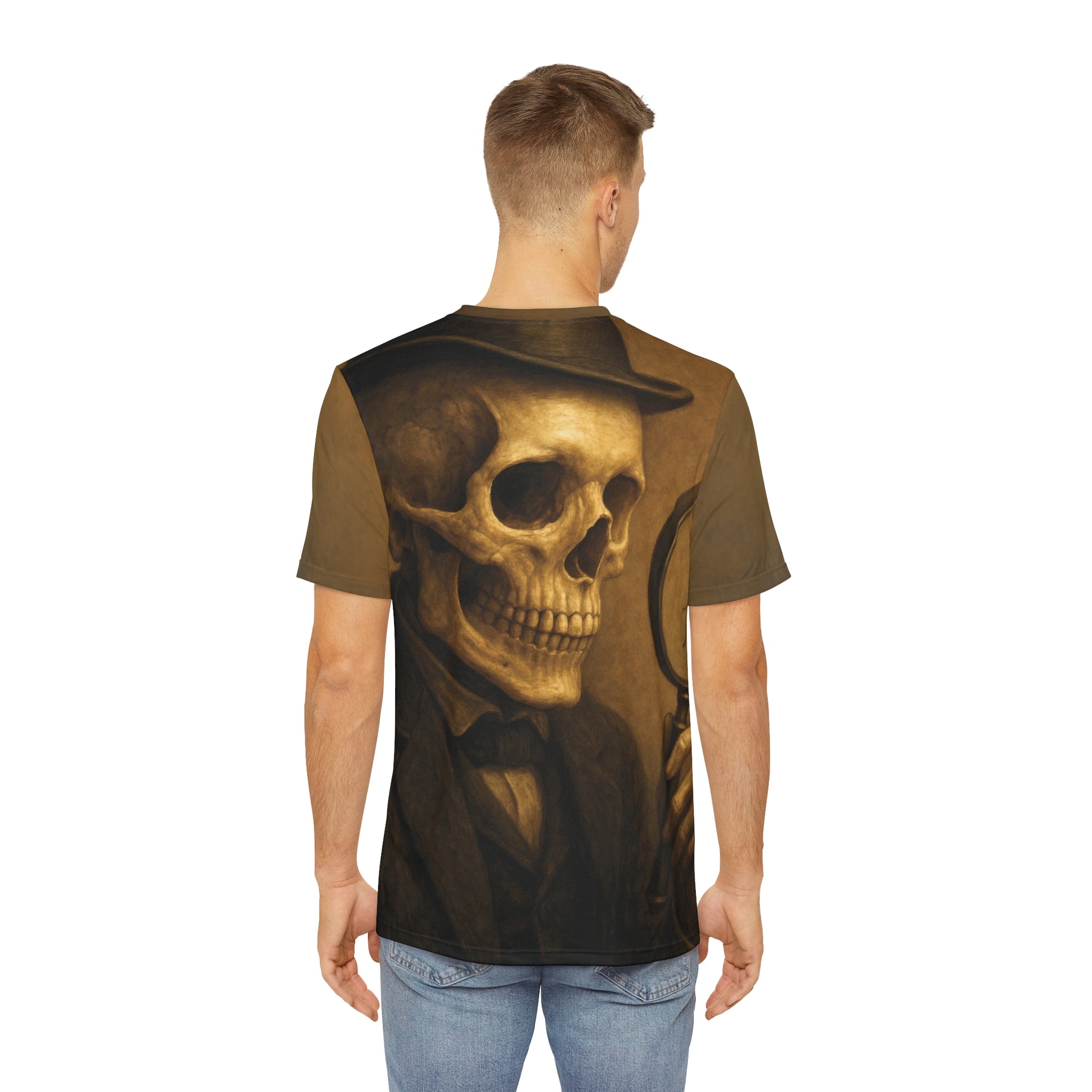 Skeleton Sleuth – Gothic AOP Unisex T-Shirt | Vintage Detective Skull Tee