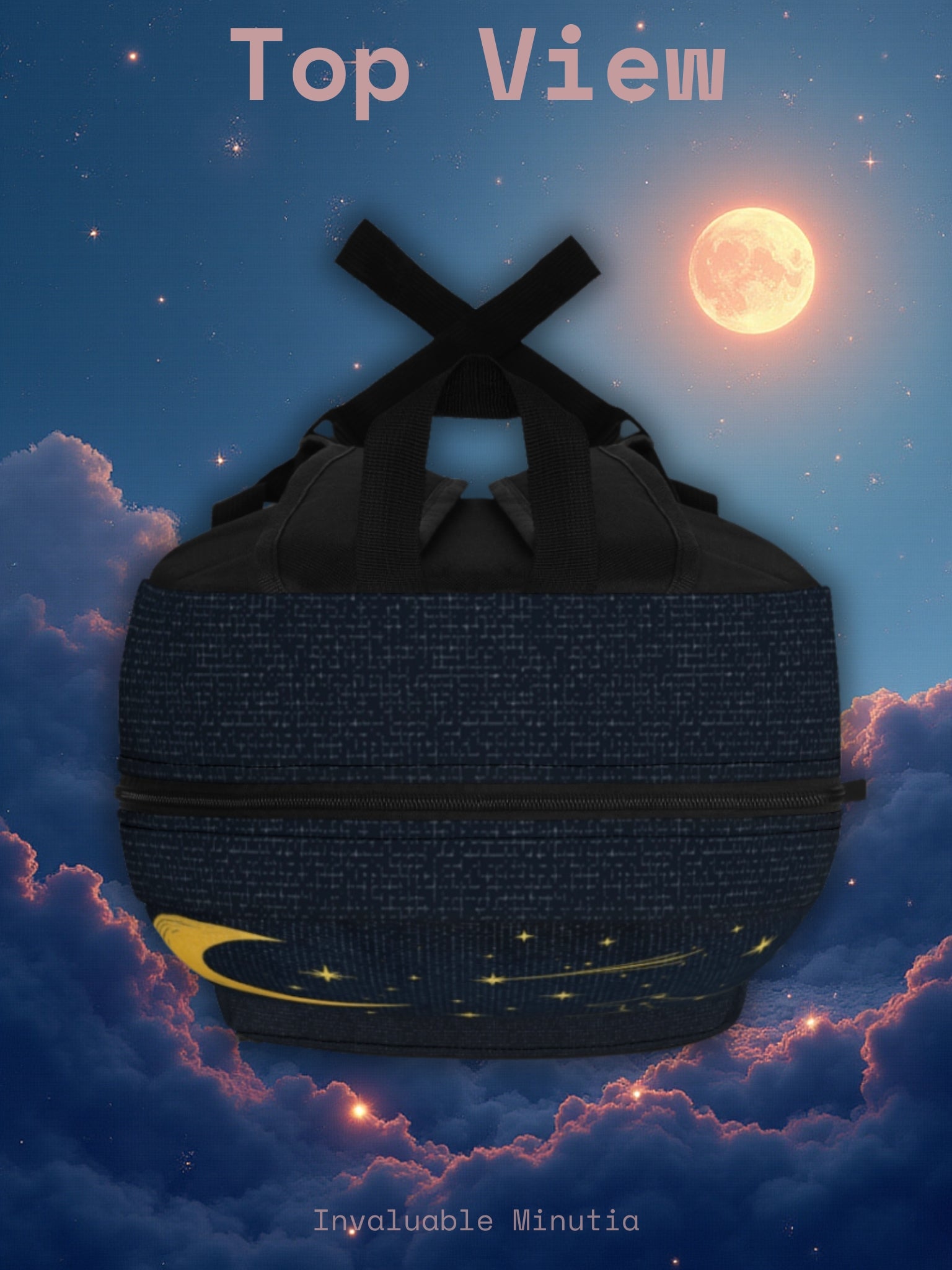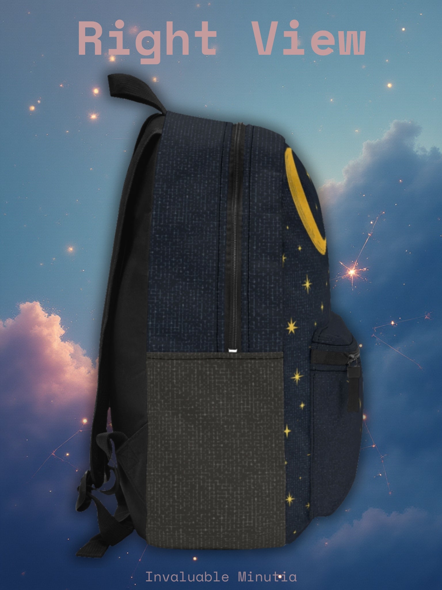 Kliv in i kosmos med denna förtrollande guldfärgade ryggsäck med himmelska konstellationer . Med ett djupt marinblått stjärnfält, gyllene måne, stjärnfall, Saturnus och andra konstellationer blandar denna väska elegans och förundran till ett bärbart konstverk. Perfekt för stjärnskådare, astrologiälskare och alla som finner magi på natthimlen.