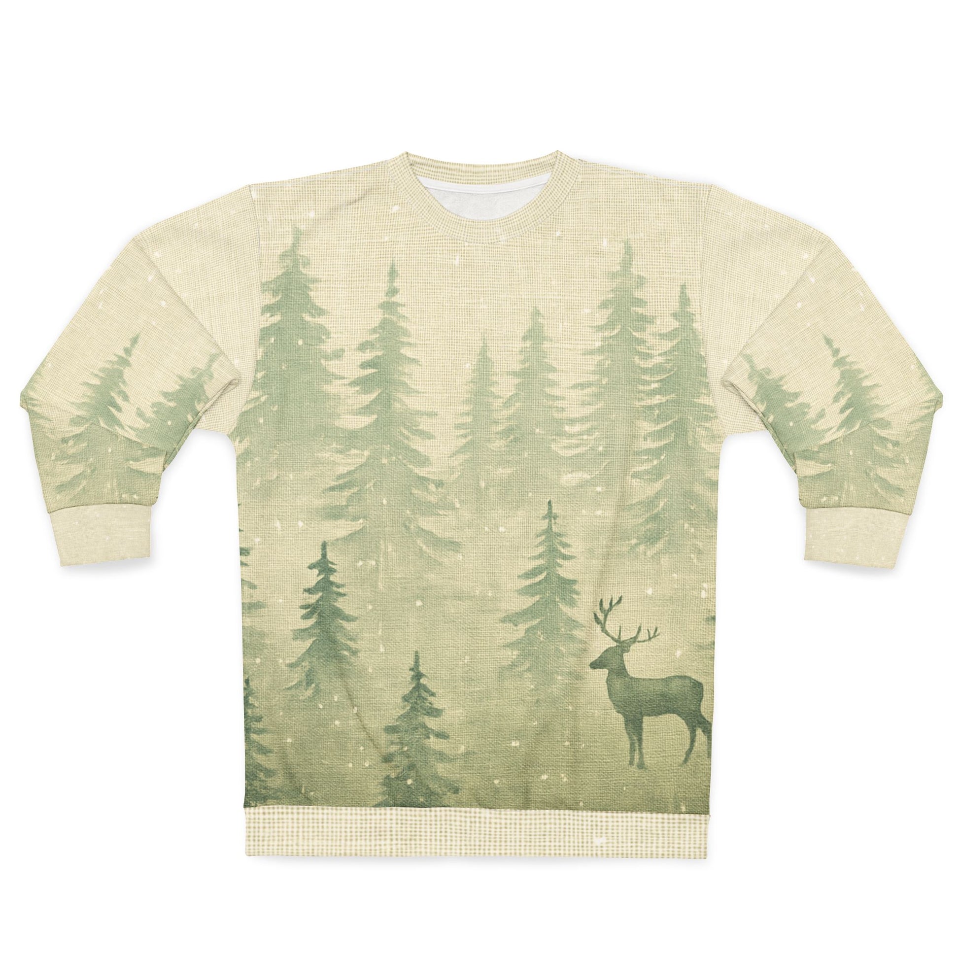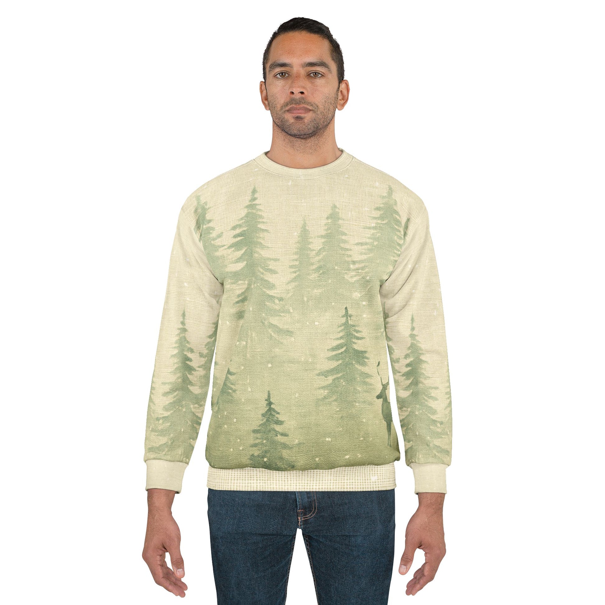 Nordic Woodlands — a soft winter hush captured in wearable form. This minimalist all-over print sweatshirt blends subtle evergreen silhouettes, snow-flecked textures, and quiet Scandinavian calm.