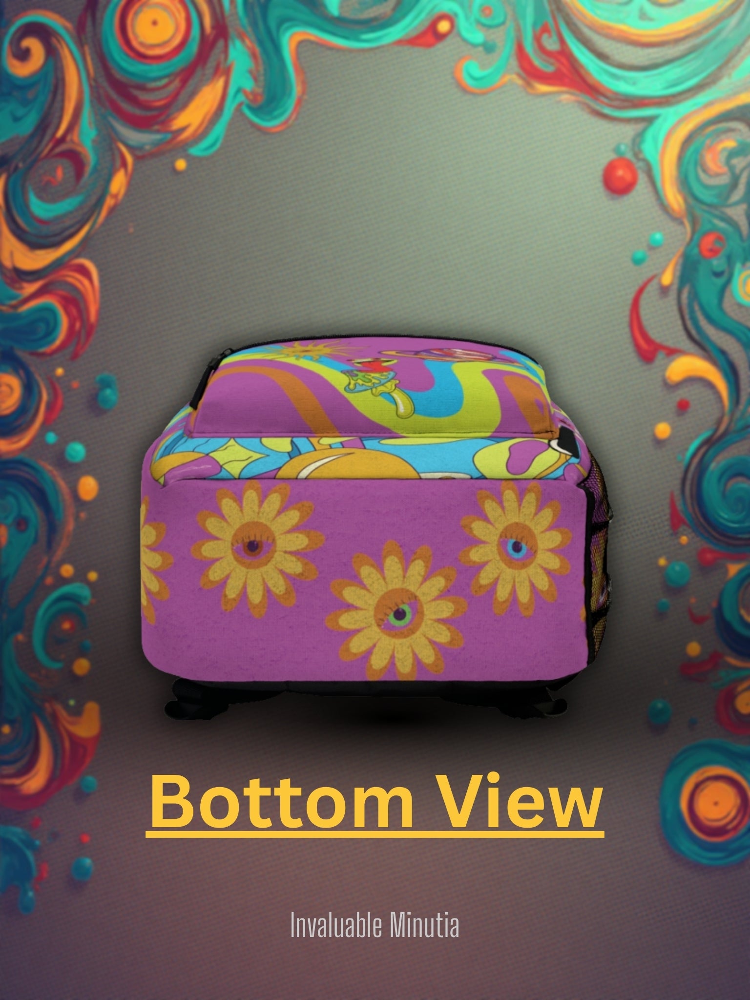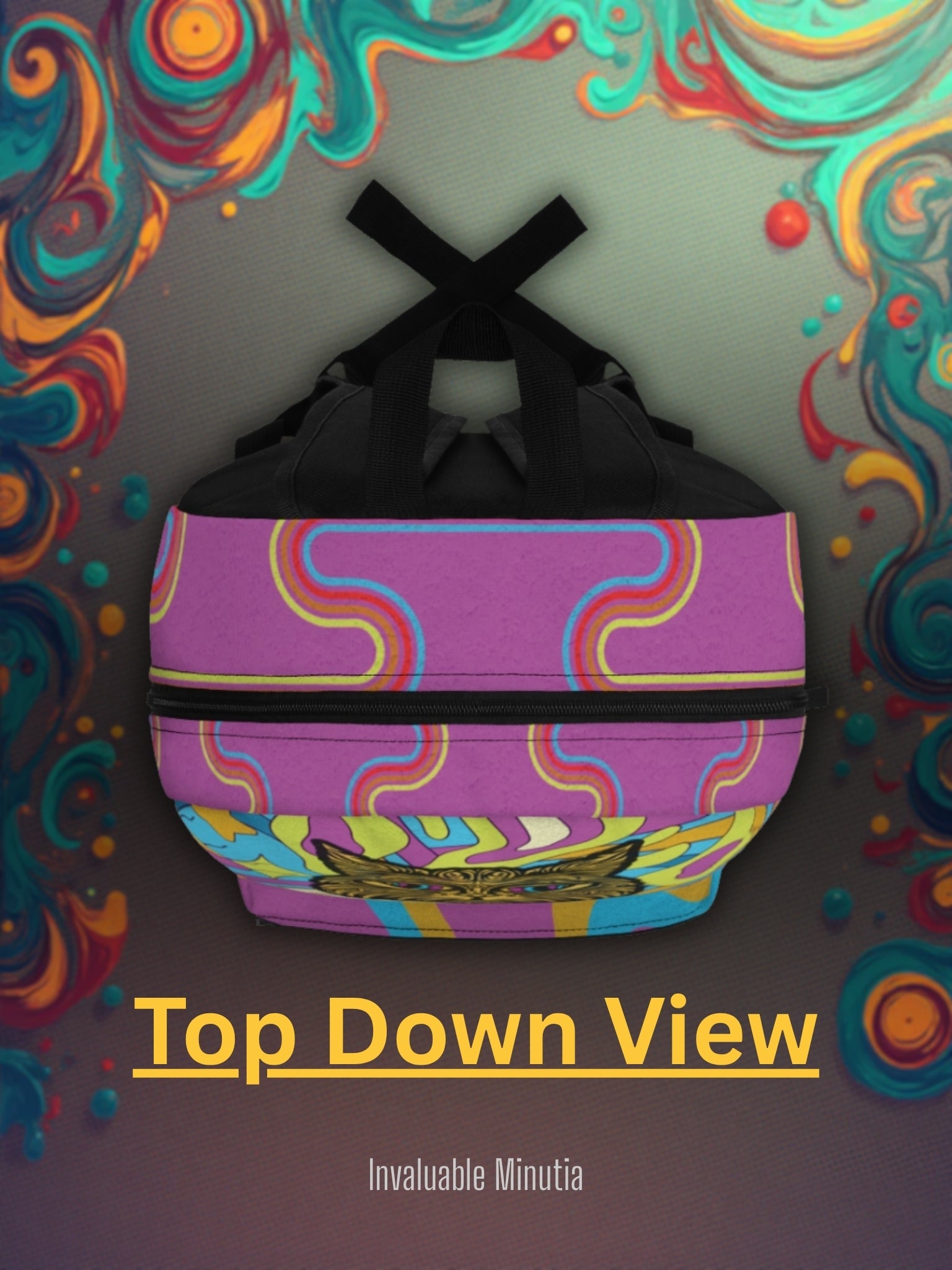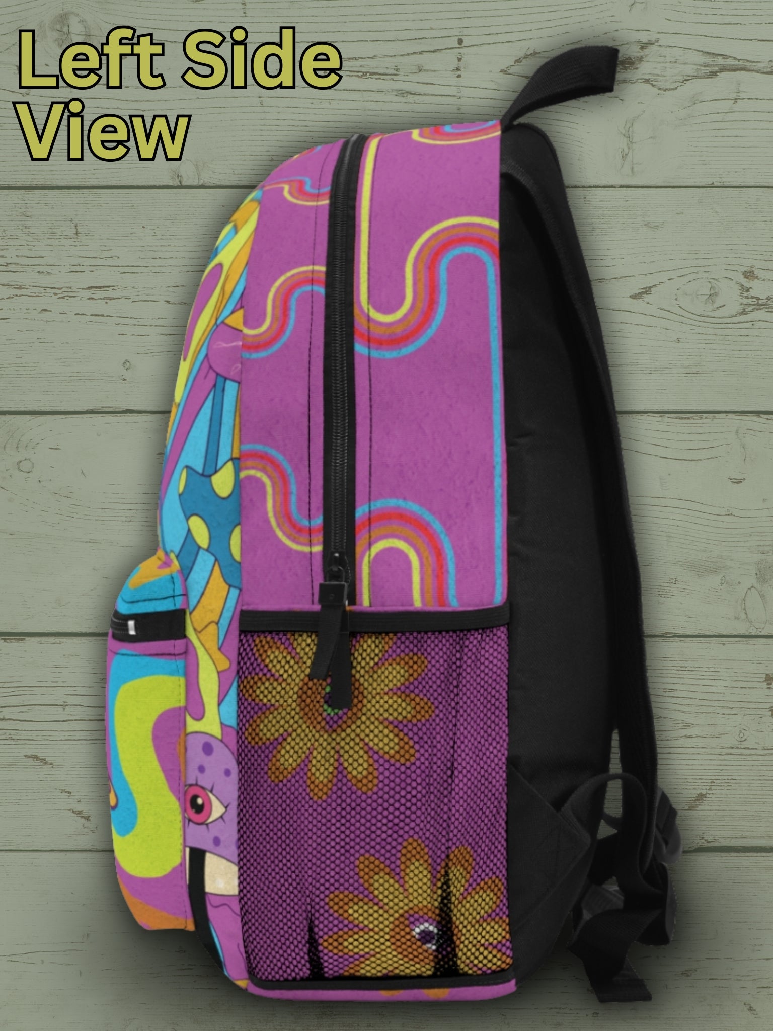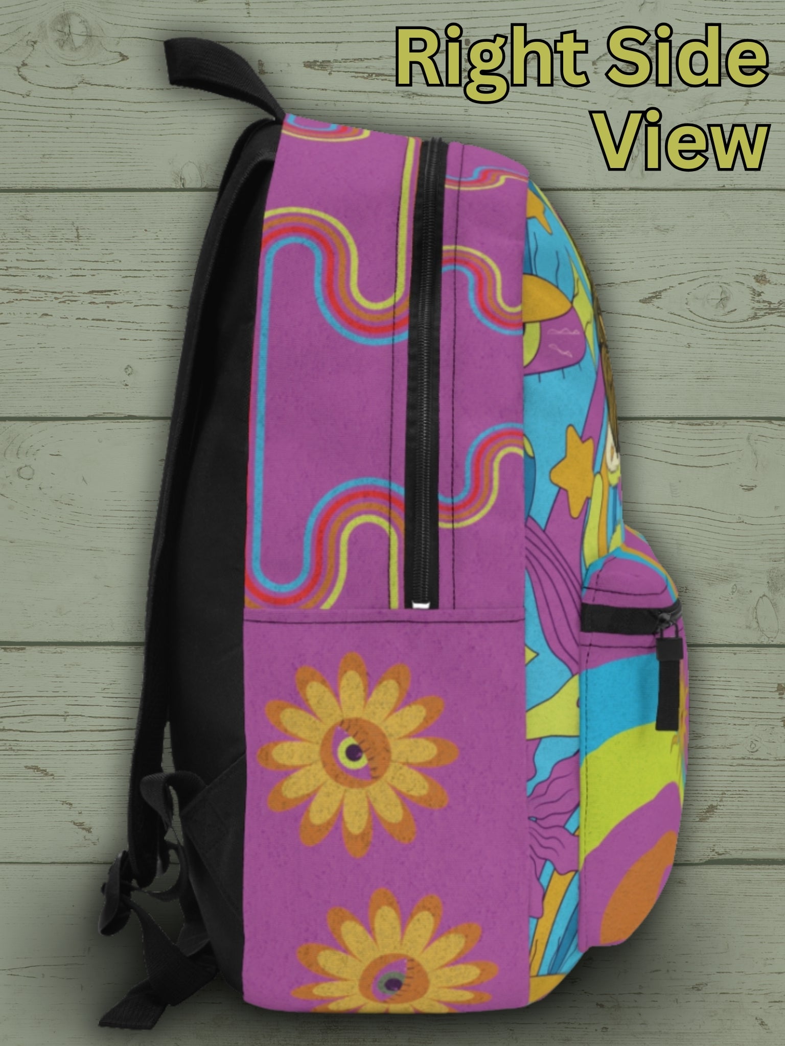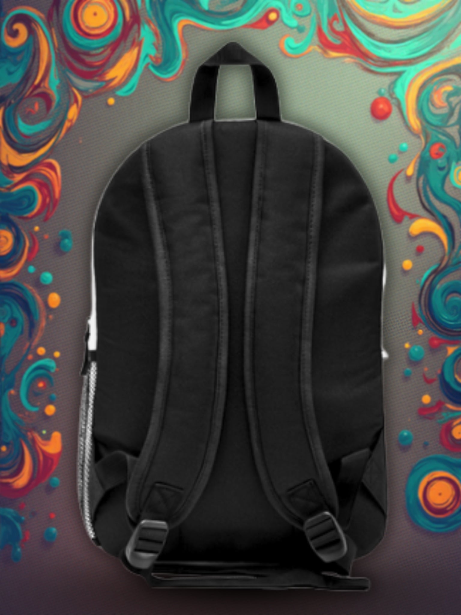 Har du någonsin önskat att din ryggsäck skulle kännas som en feberdröm och ett andedjur i ett? Denna livfulla väska med heltäckande tryck (AOP) har en hypnotisk gyllene katt omgiven av virvlande galaxer, en svamp som slickas av en galen mask och annat härligt hjärnsmältande kaos. Det är konstigt, det är djärvt och det är absolut inte en Canva-mall – det tog timmar av lager-på-lager, redigering och pixelperfekt placering att förverkliga. Om din stil skriker "acid trip på ett rymdrave" är den här för dig.