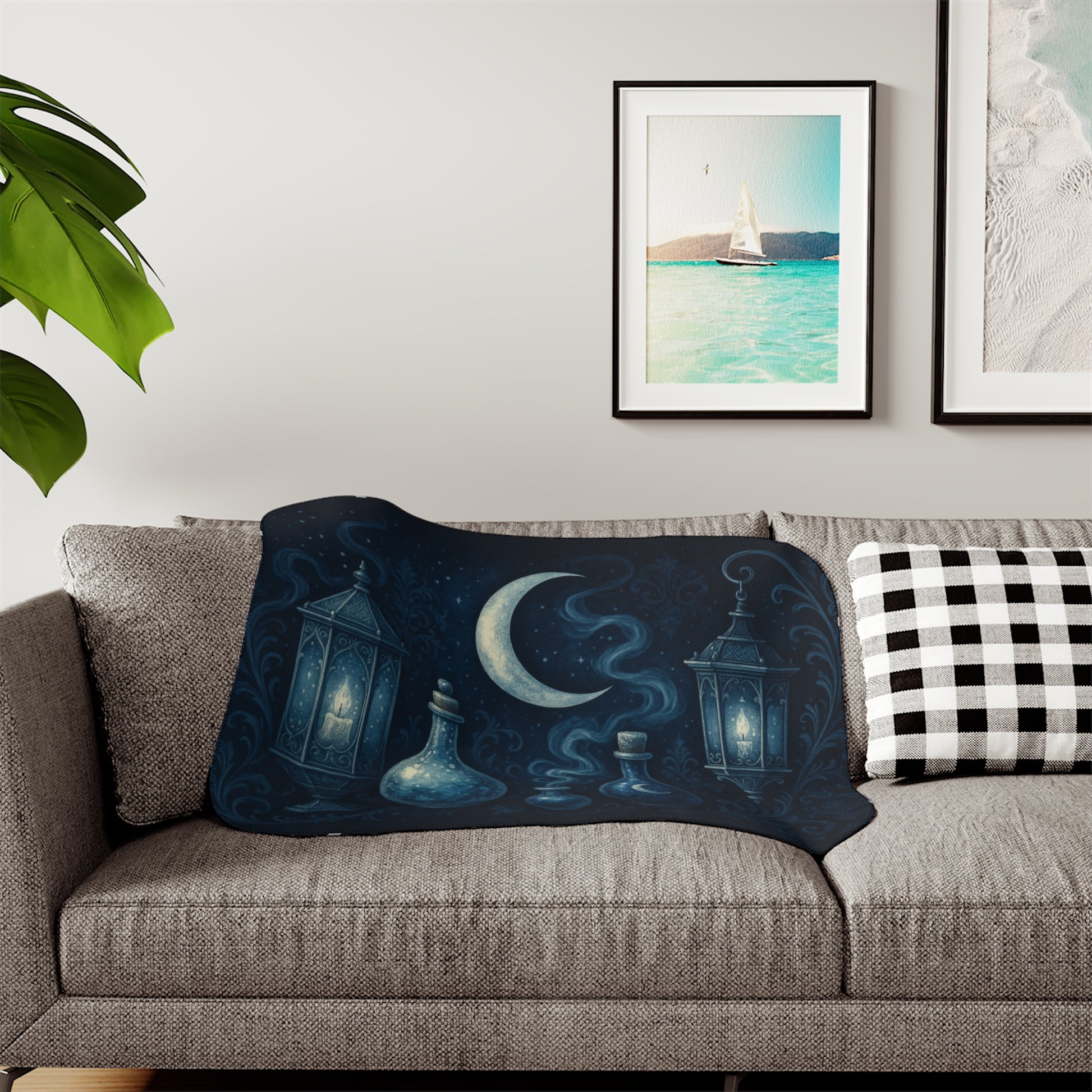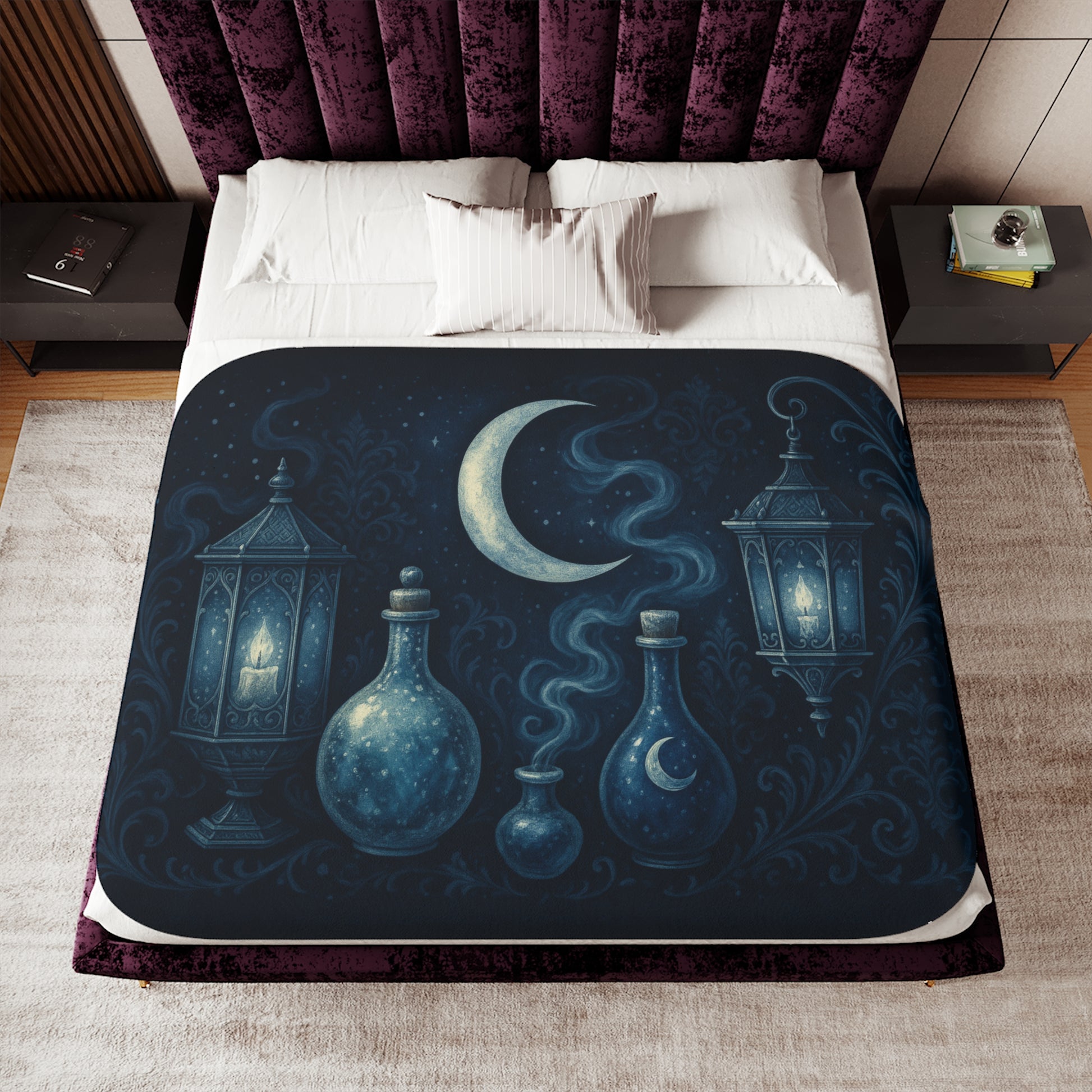 Witchy Winter Sherpa Blanket â Crescent Moon, Lanterns & Potion Bottles